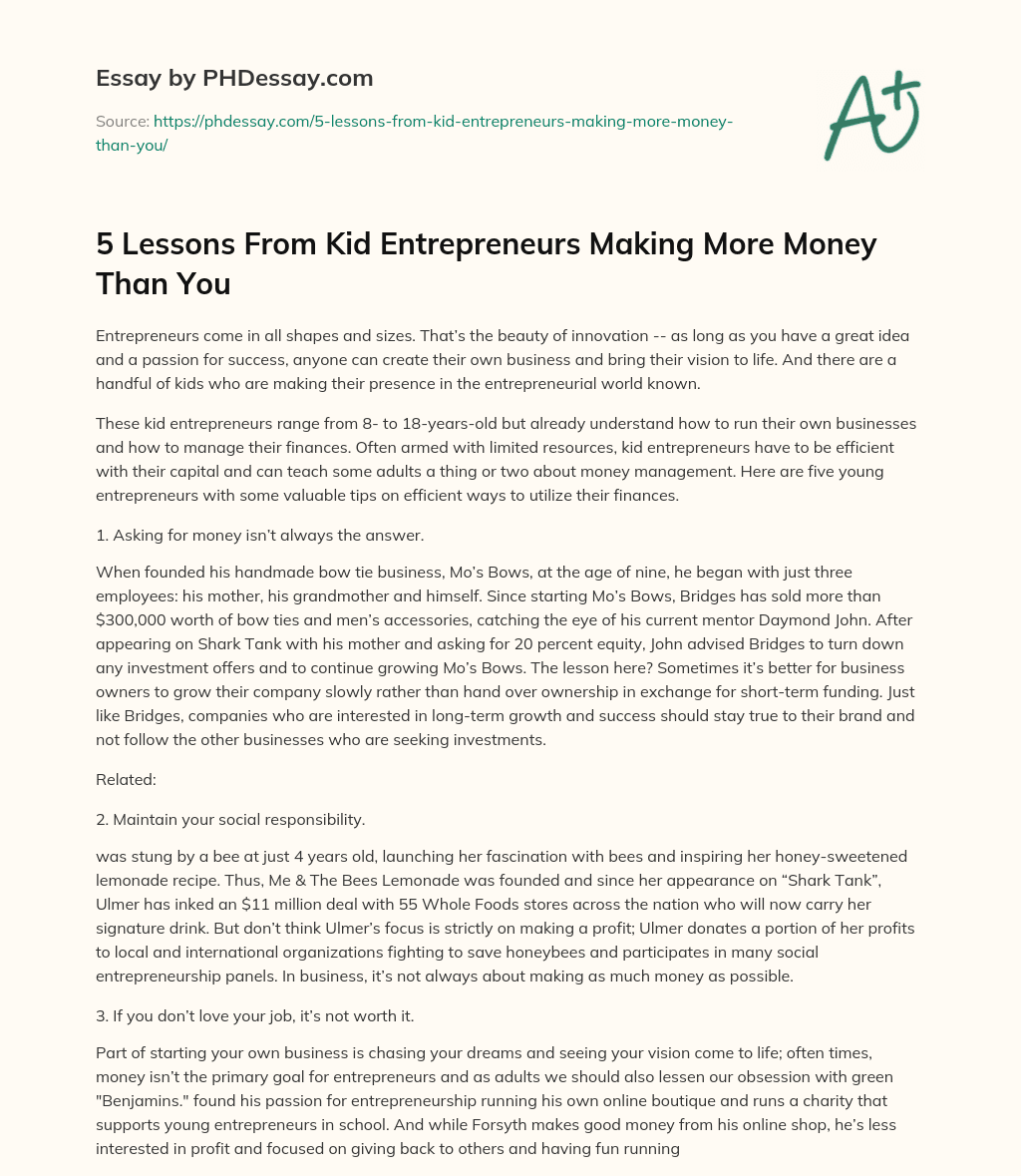 Order custom essay 5 Lessons From Kid Entrepreneurs Making More Money Than You with free plagiarism report