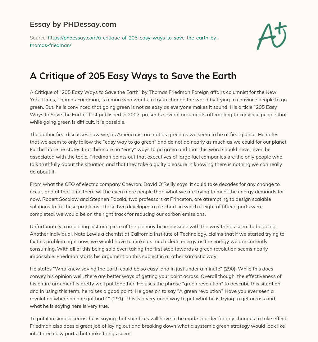 A Critique of 205 Easy Ways to Save the Earth. (2017, Apr 24). Retrieved from https://phdessay.com/a-critique-of-205-easy-ways-to-save-the-earth-by-thomas-friedman/