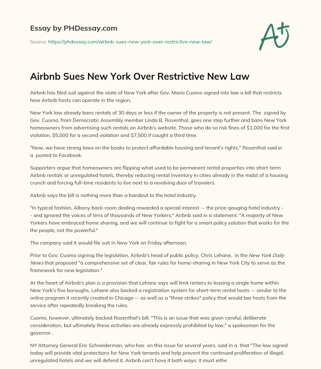 Order custom essay Airbnb Sues New York Over Restrictive New Law with free plagiarism report