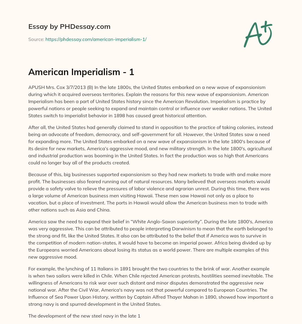 American Imperialism – 1. (2017, Mar 22). Retrieved from https://phdessay.com/american-imperialism-1/