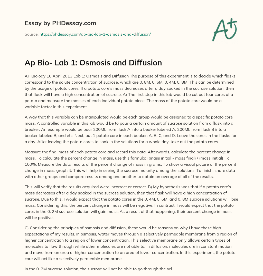 Ap Bio- Lab 1: Osmosis and Diffusion. (2017, Mar 26). Retrieved from https://phdessay.com/ap-bio-lab-1-osmosis-and-diffusion/