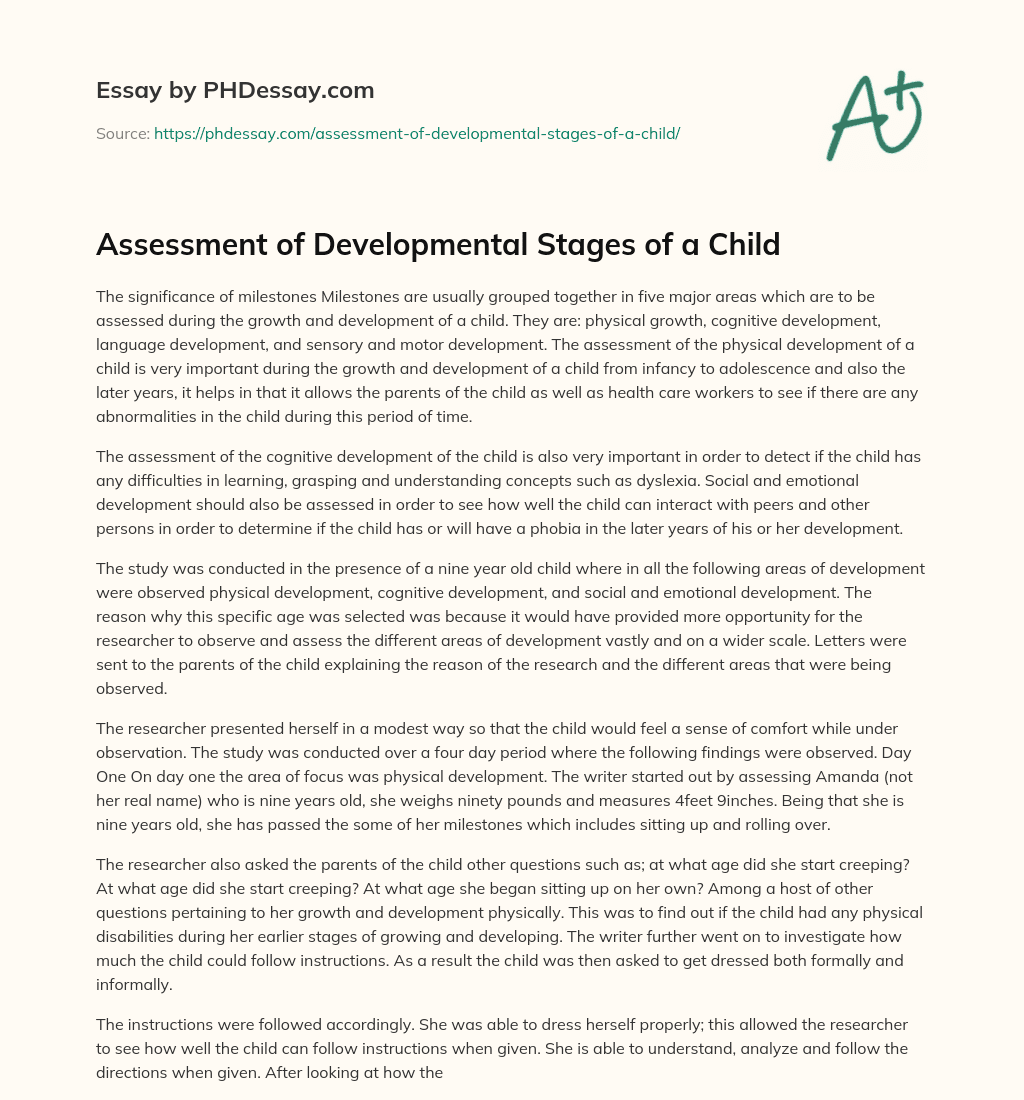 Assessment of Developmental Stages of a Child. (2018, May 25). Retrieved from https://phdessay.com/assessment-of-developmental-stages-of-a-child/
