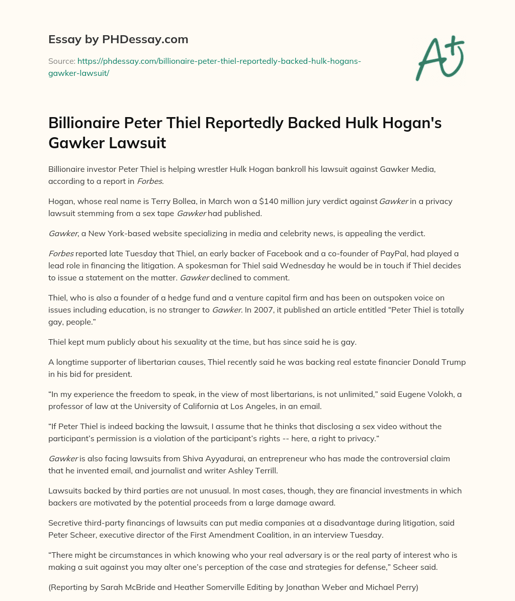 Billionaire Peter Thiel Reportedly Backed Hulk Hogan’s Gawker Lawsuit. (2018, Dec 01). Retrieved from https://phdessay.com/billionaire-peter-thiel-reportedly-backed-hulk-hogans-gawker-lawsuit/