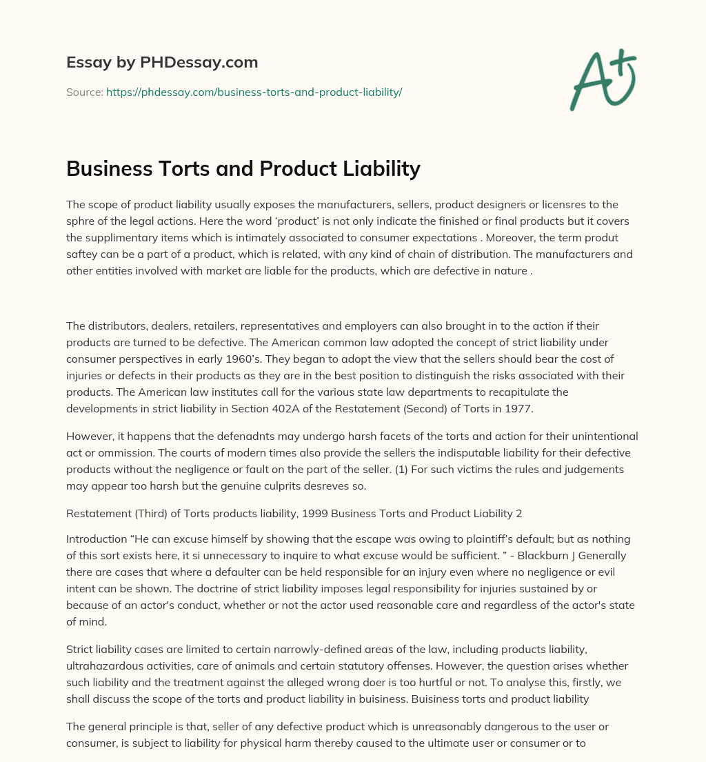 Order custom essay Business Torts and Product Liability with free plagiarism report