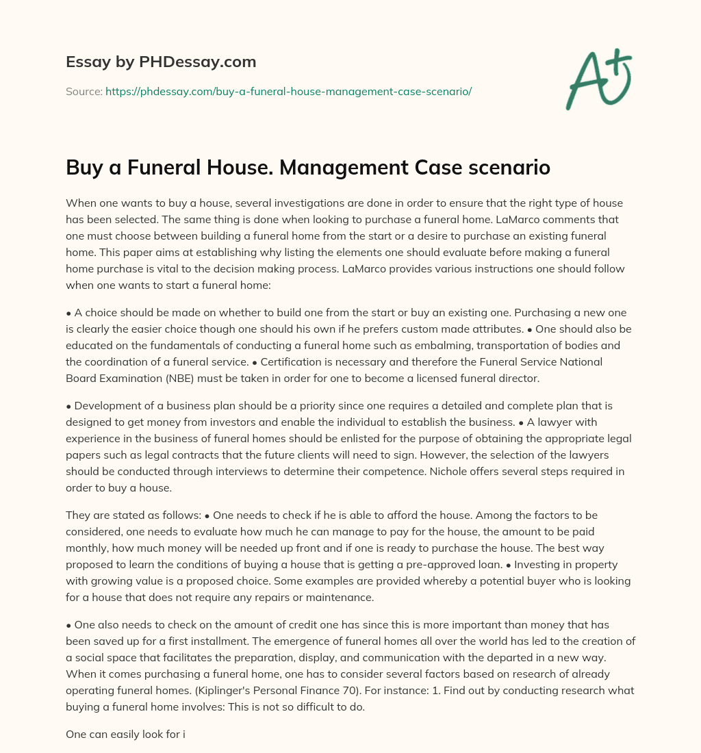 Order custom essay Buy a Funeral House. Management Case scenario with free plagiarism report