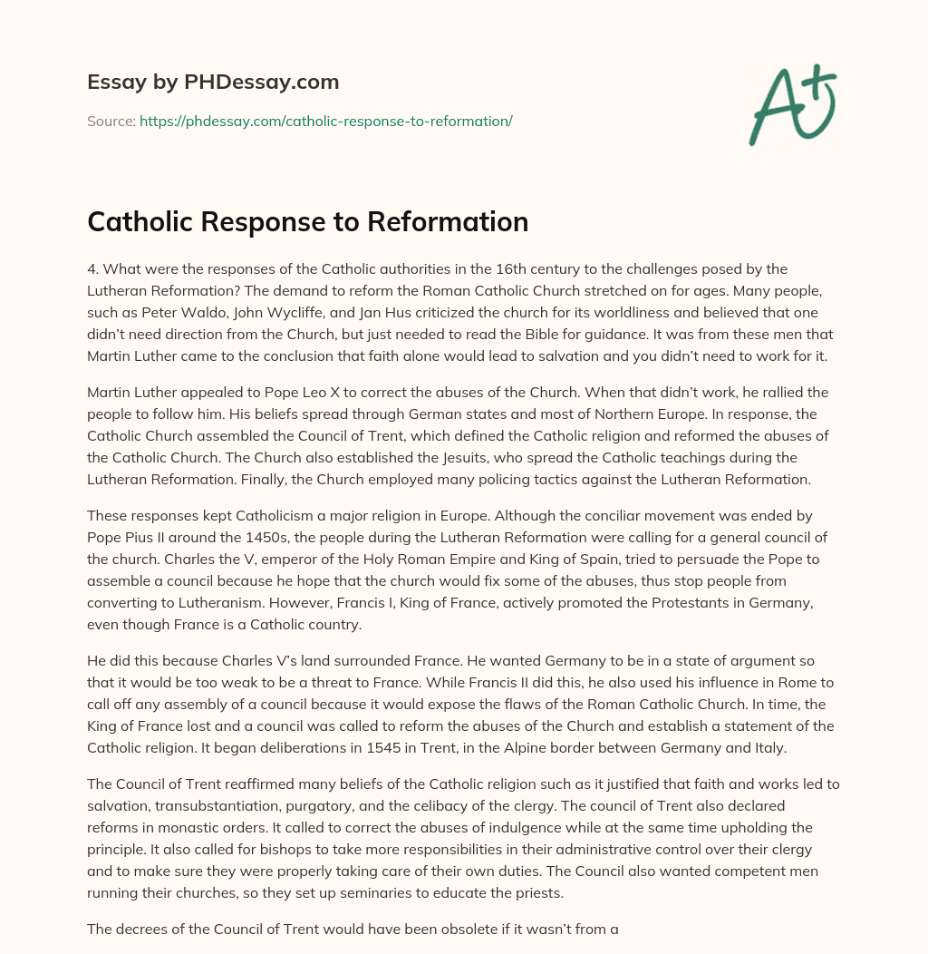 Catholic Response to Reformation. (2017, Feb 26). Retrieved from https://phdessay.com/catholic-response-to-reformation/