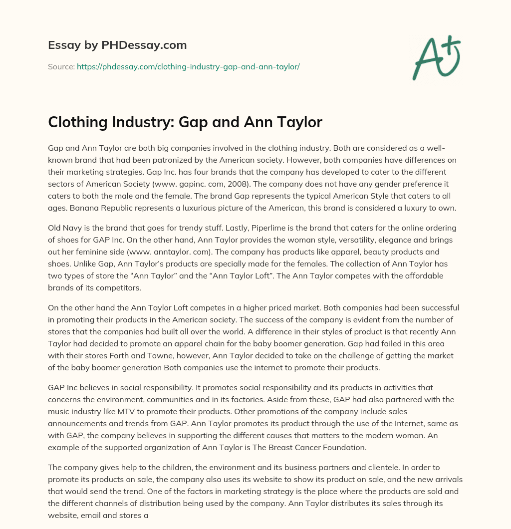 Clothing Industry: Gap and Ann Taylor. (2018, Jan 31). Retrieved from https://phdessay.com/clothing-industry-gap-and-ann-taylor/
