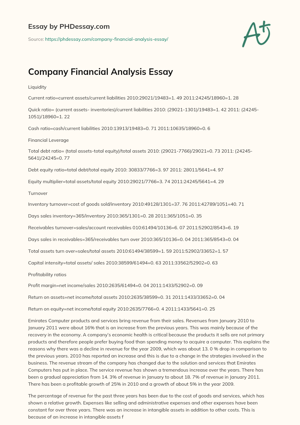 Company Financial Analysis Essay. (2017, Jan 17). Retrieved from https://phdessay.com/company-financial-analysis-essay/
