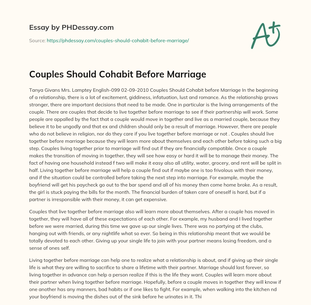 Tanya Givans Mrs. Lamptey English-099 02-09-2010 Couples Should Cohabit before Marriage In the beginning of a relationship, there is a lot of excitement, giddiness, infatuation, lust and romance. As the relationship grows stronger, there are important decisions that need to be made. One in particular is the living arrangements of the couple. There are couples that decide to live together before marriage to see if their partnership will work. Some people are appalled by the fact that a couple would move in together and live as a married couple, because they believe it to be ungodly and that ex and children should only be a result of marriage. However, there are people who do not believe in religion, nor do they care if you live together before marriage or not . Couples should live together before marriage because they will learn more about themselves and each other before taking such a big step. Couples living together prior to marriage will find out if they are financially compatible. Once a couple makes the transition of moving in together, they will see how easy or hard it will be to manage their money. The fact of having one household instead f two will make it easy also all utility, water, grocery, and rent will be split in half. Living together before marriage will help a couple find out if maybe one is too frivolous with their money, and if the situation could be controlled before taking the next step into marriage. For example, maybe the boyfriend will get his paycheck go out to the bar spend and all of his money then come home broke. As a result, the girl is stuck paying the bills for the month. The financial burden of taken care of oneself is hard, but if a partner is irresponsible with their money, it can get expensive.