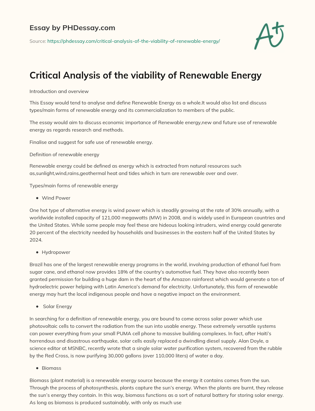 Critical Analysis of the viability of Renewable Energy. (2019, Mar 24). Retrieved from https://phdessay.com/critical-analysis-of-the-viability-of-renewable-energy/