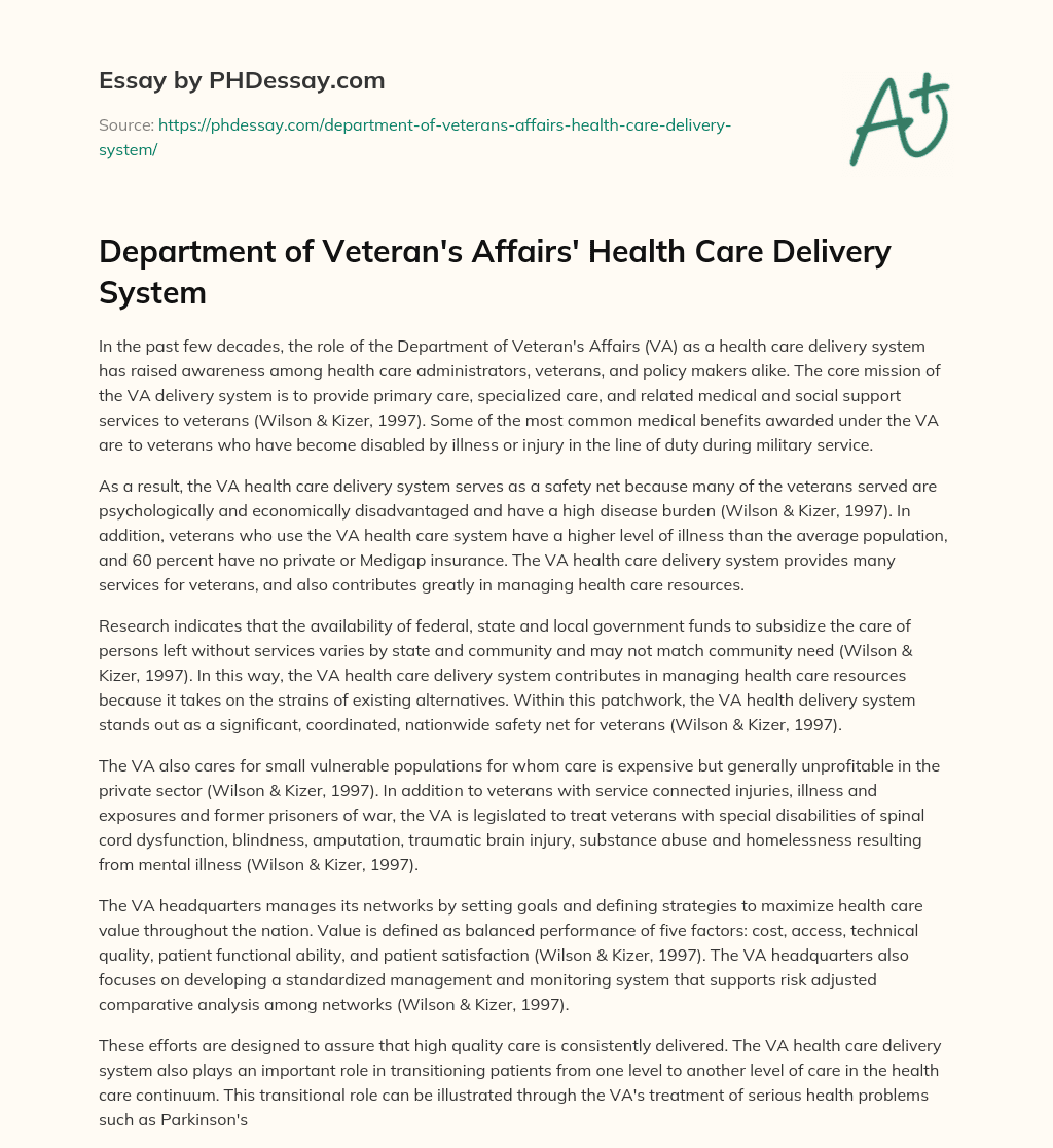 Order custom essay Department of Veteran’s Affairs’ Health Care Delivery System with free plagiarism report