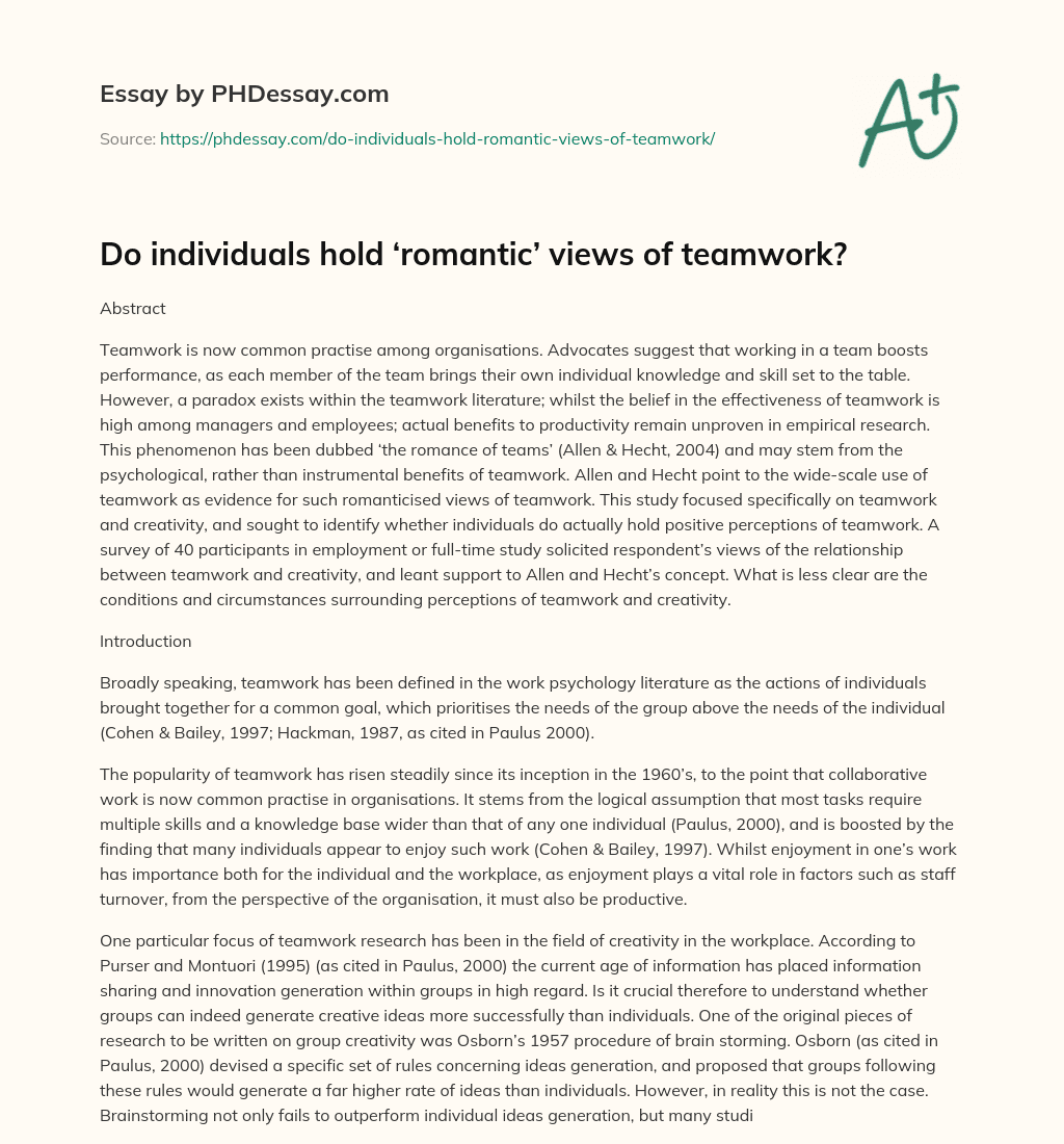 Order custom essay Do individuals hold ‘romantic’ views of teamwork? with free plagiarism report