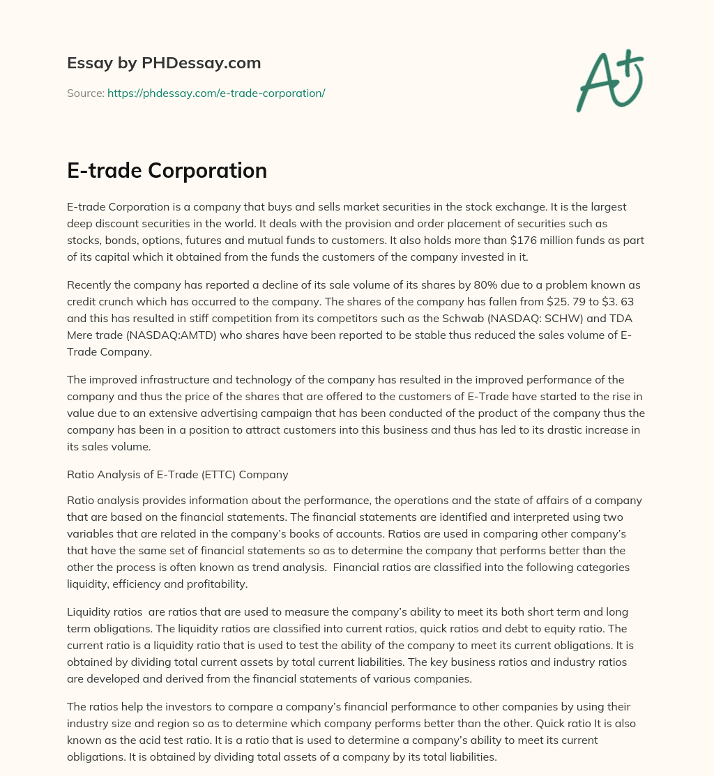 E-trade Corporation. (2018, Mar 04). Retrieved from https://phdessay.com/e-trade-corporation/