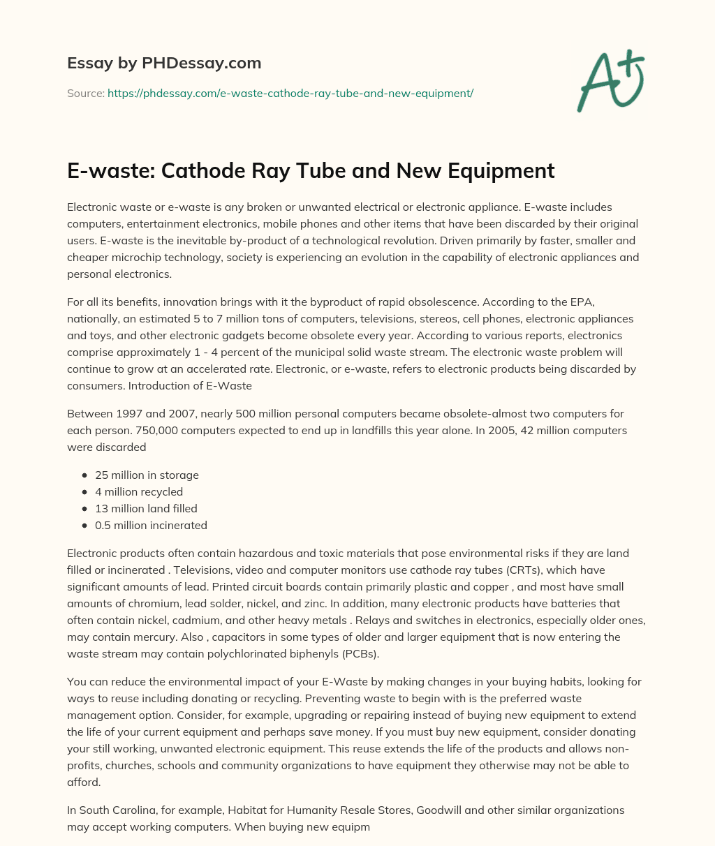 E-waste: Cathode Ray Tube and New Equipment. (2016, Aug 11). Retrieved from https://phdessay.com/e-waste-cathode-ray-tube-and-new-equipment/