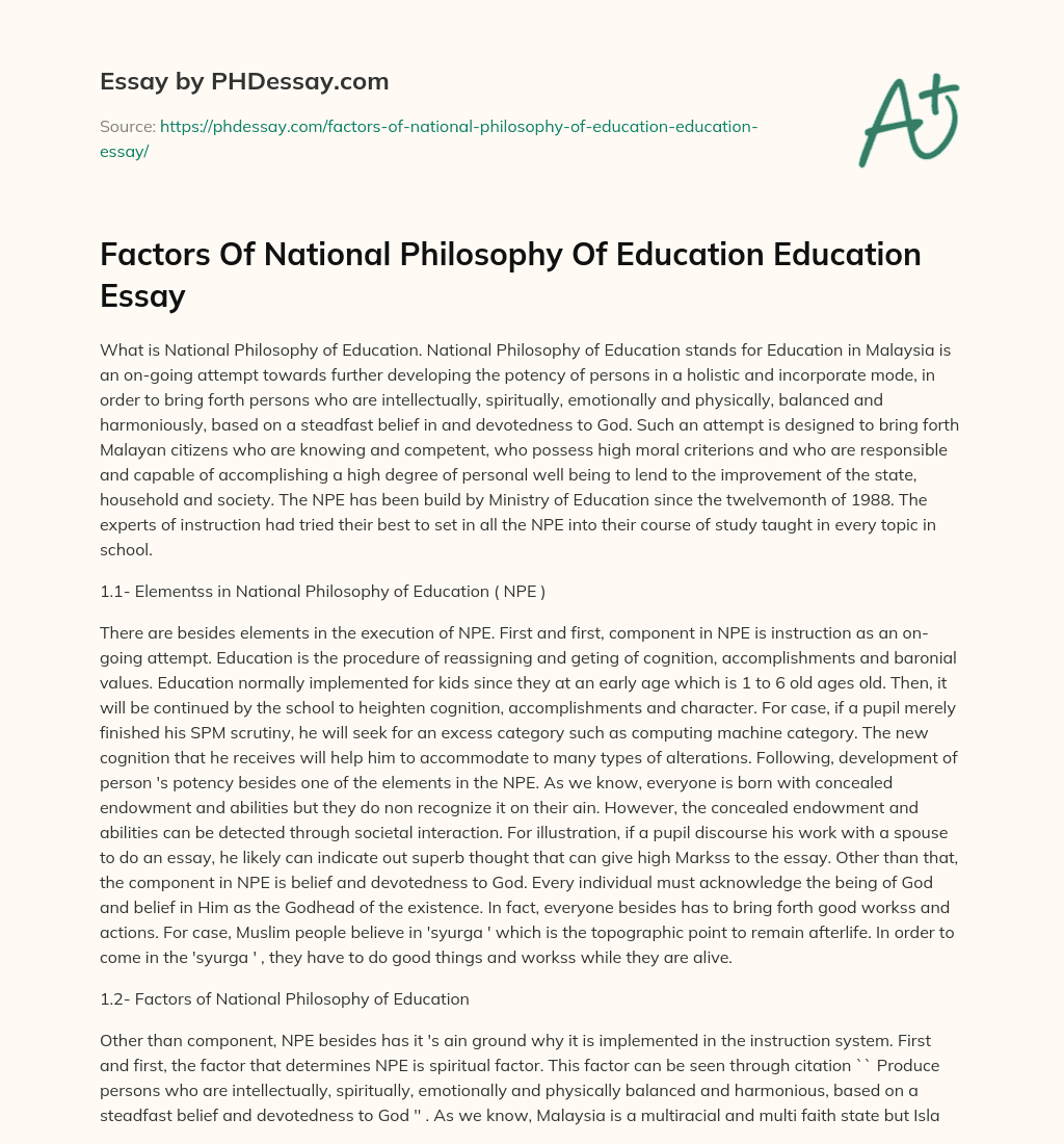 Order custom essay Factors Of National Philosophy Of Education Education Essay with free plagiarism report