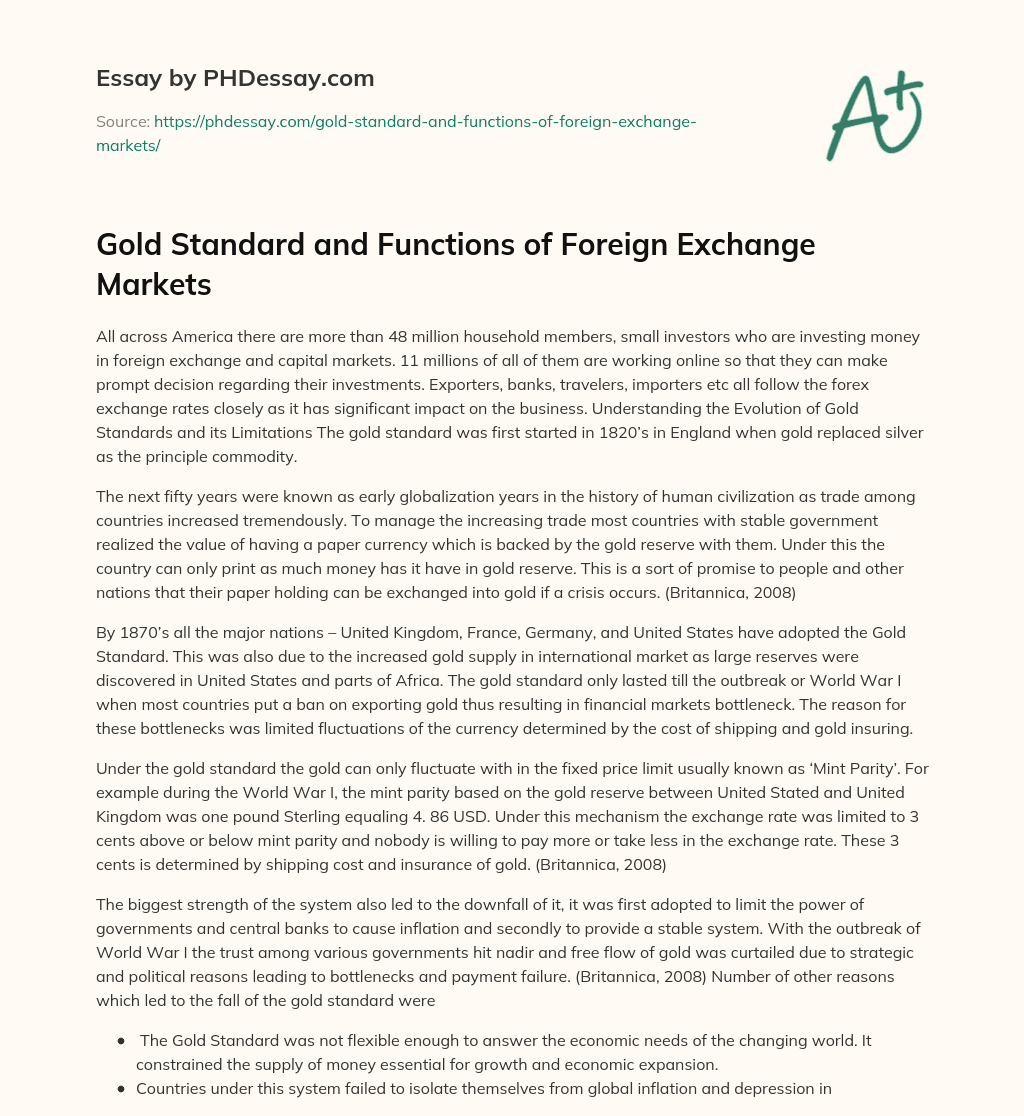 Order custom essay Gold Standard and Functions of Foreign Exchange Markets with free plagiarism report