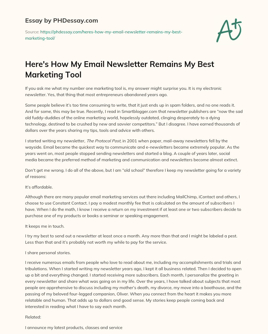 Here’s How My Email Newsletter Remains My Best Marketing Tool. (2018, Apr 20). Retrieved from https://phdessay.com/heres-how-my-email-newsletter-remains-my-best-marketing-tool/