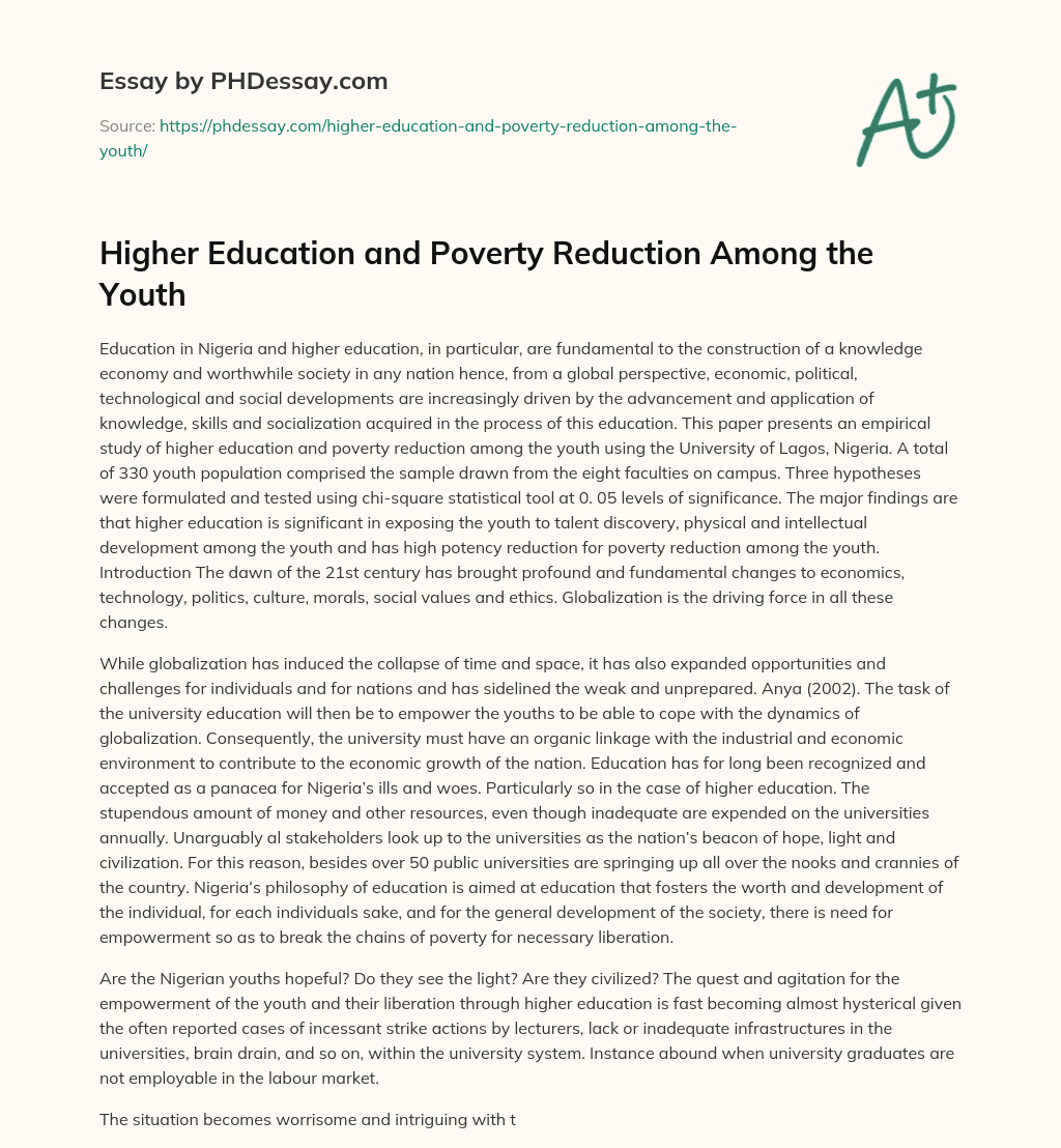 Education in Nigeria and higher education, in particular, are fundamental to the construction of a knowledge economy and worthwhile society in any nation hence, from a global perspective, economic, political, technological and social developments are increasingly driven by the advancement and application of knowledge, skills and socialization acquired in the process of this education. This paper presents an empirical study of higher education and poverty reduction among the youth using the University of Lagos, Nigeria. A total of 330 youth population comprised the sample drawn from the eight faculties on campus. Three hypotheses were formulated and tested using chi-square statistical tool at 0. 05 levels of significance. The major findings are that higher education is significant in exposing the youth to talent discovery, physical and intellectual development among the youth and has high potency reduction for poverty reduction among the youth. Introduction The dawn of the 21st century has brought profound and fundamental changes to economics, technology, politics, culture, morals, social values and ethics. Globalization is the driving force in all these changes.