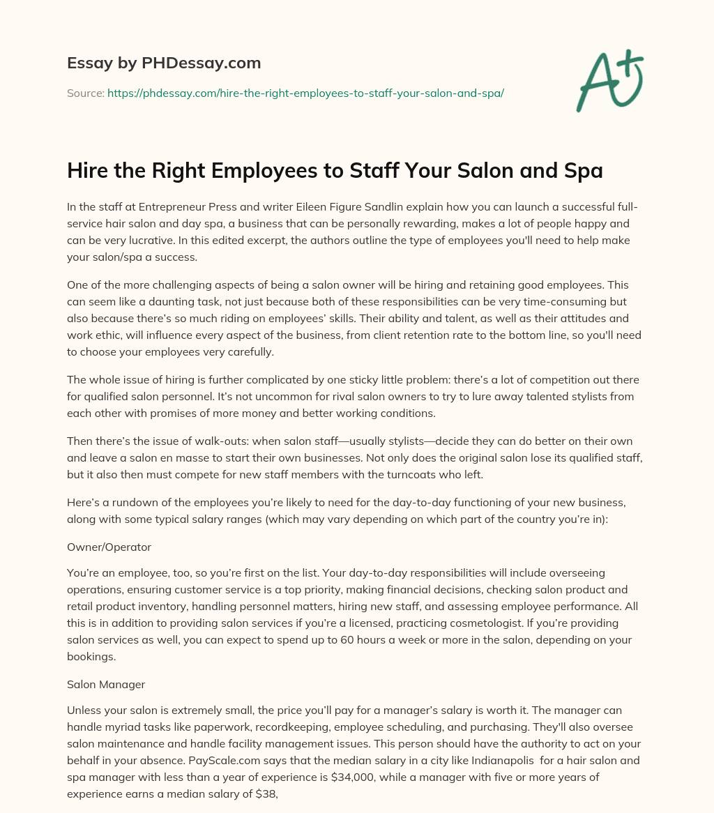Order custom essay Hire the Right Employees to Staff Your Salon and Spa with free plagiarism report