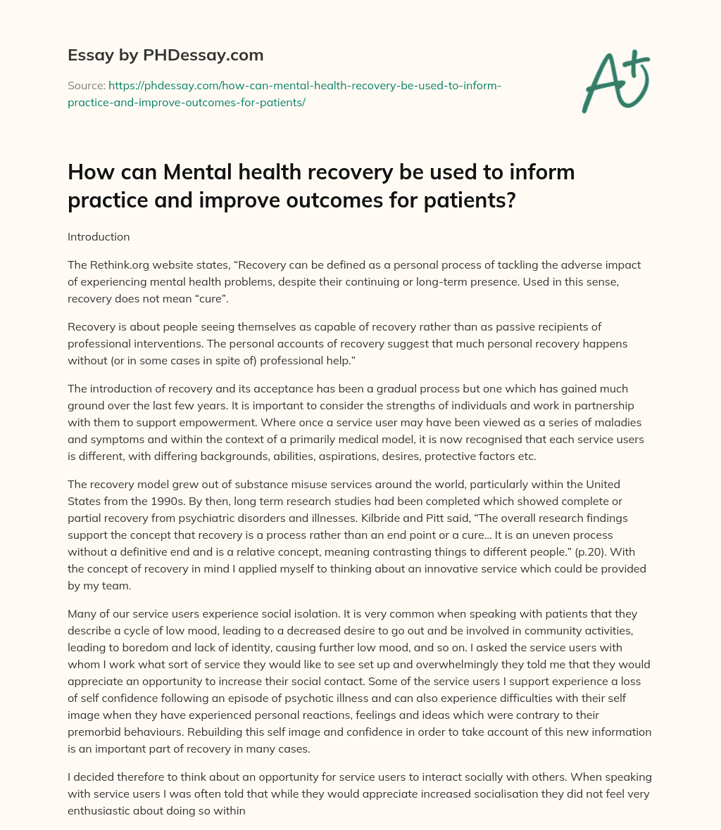 How can Mental health recovery be used to inform practice and improve outcomes for patients?. (2019, Mar 29). Retrieved from https://phdessay.com/how-can-mental-health-recovery-be-used-to-inform-practice-and-improve-outcomes-for-patients/