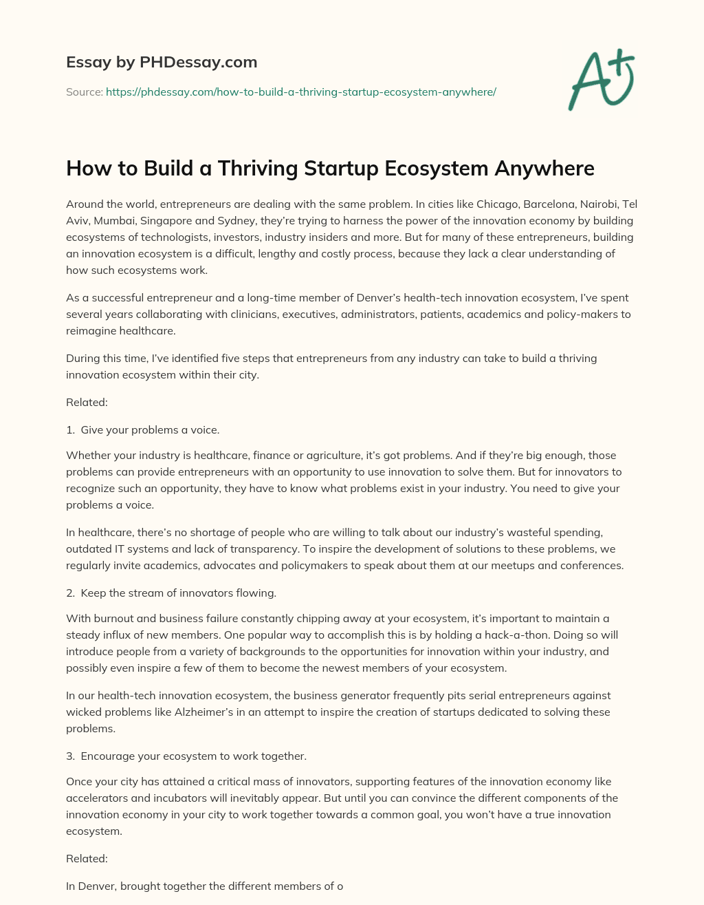 How to Build a Thriving Startup Ecosystem Anywhere. (2018, Apr 29). Retrieved from https://phdessay.com/how-to-build-a-thriving-startup-ecosystem-anywhere/