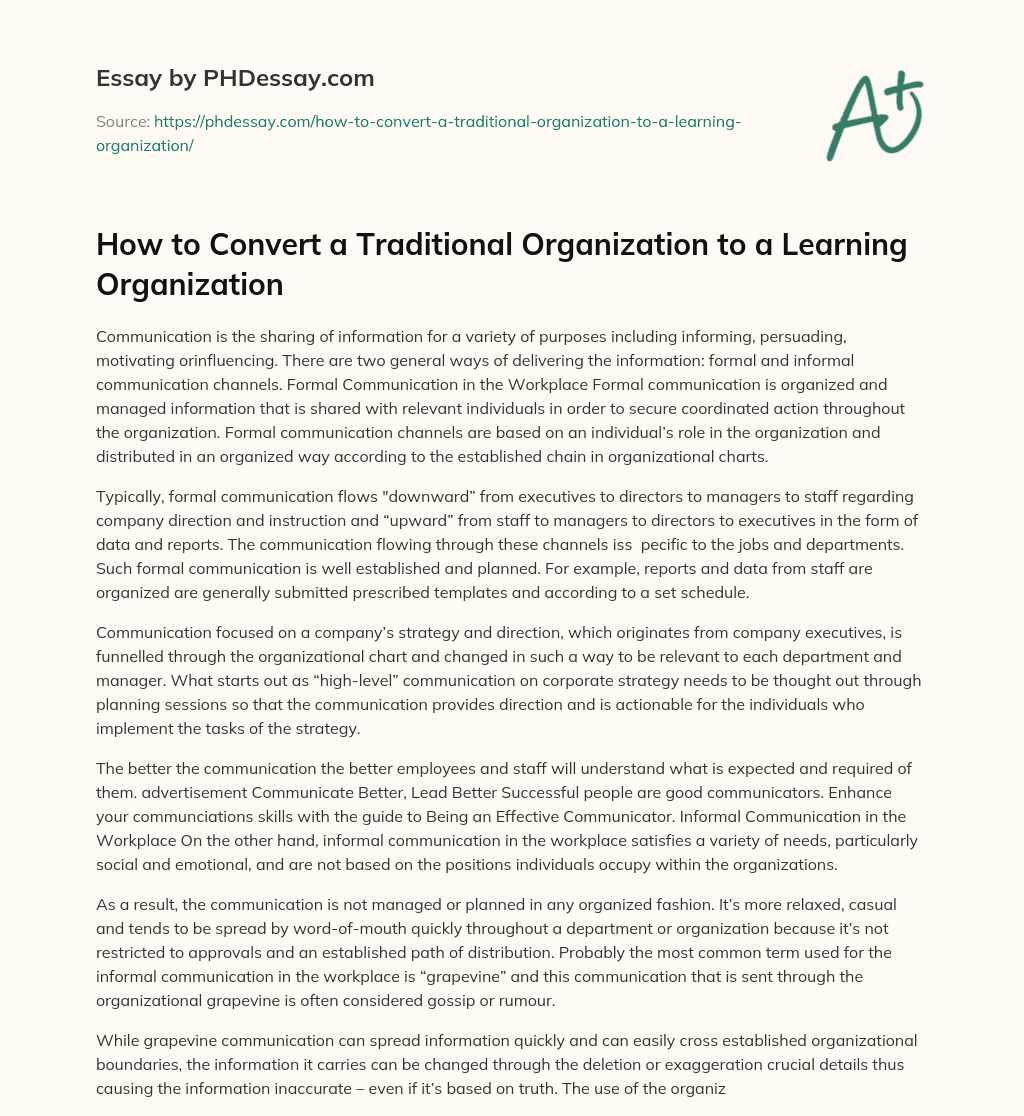 Order custom essay How to Convert a Traditional Organization to a Learning Organization with free plagiarism report
