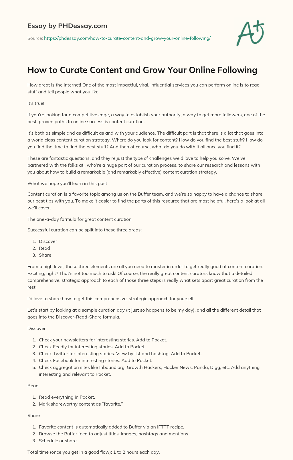 How to Curate Content and Grow Your Online Following. (2018, Apr 30). Retrieved from https://phdessay.com/how-to-curate-content-and-grow-your-online-following/