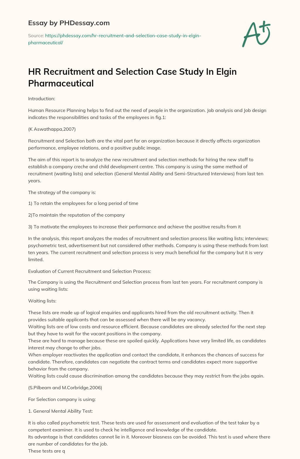HR Recruitment and Selection Case Study In Elgin Pharmaceutical
