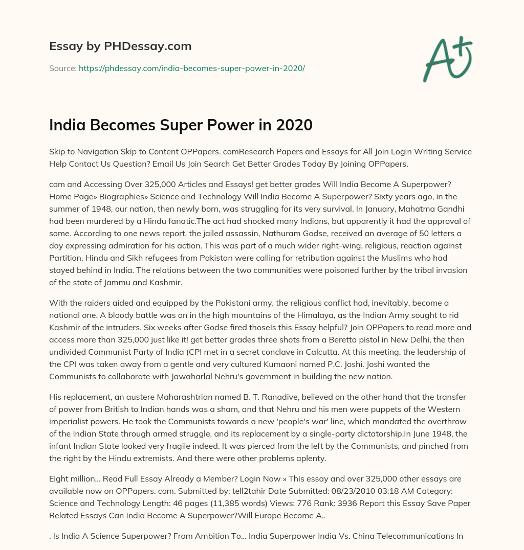 com and Accessing Over 325,000 Articles and Essays! get better grades Will India Become A Superpower? Home Page» Biographies» Science and Technology Will India Become A Superpower? Sixty years ago, in the summer of 1948, our nation, then newly born, was struggling for its very survival. In January, Mahatma Gandhi had been murdered by a Hindu fanatic.The act had shocked many Indians, but apparently it had the approval of some. According to one news report, the jailed assassin, Nathuram Godse, received an average of 50 letters a day expressing admiration for his action. This was part of a much wider right-wing, religious, reaction against Partition. Hindu and Sikh refugees from Pakistan were calling for retribution against the Muslims who had stayed behind in India. The relations between the two communities were poisoned further by the tribal invasion of the state of Jammu and Kashmir.