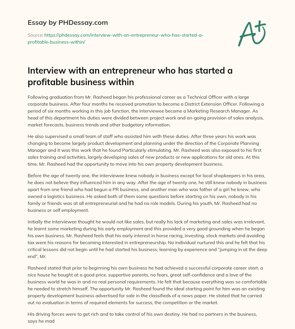 Order custom essay Interview with an entrepreneur who has started a profitable business within with free plagiarism report