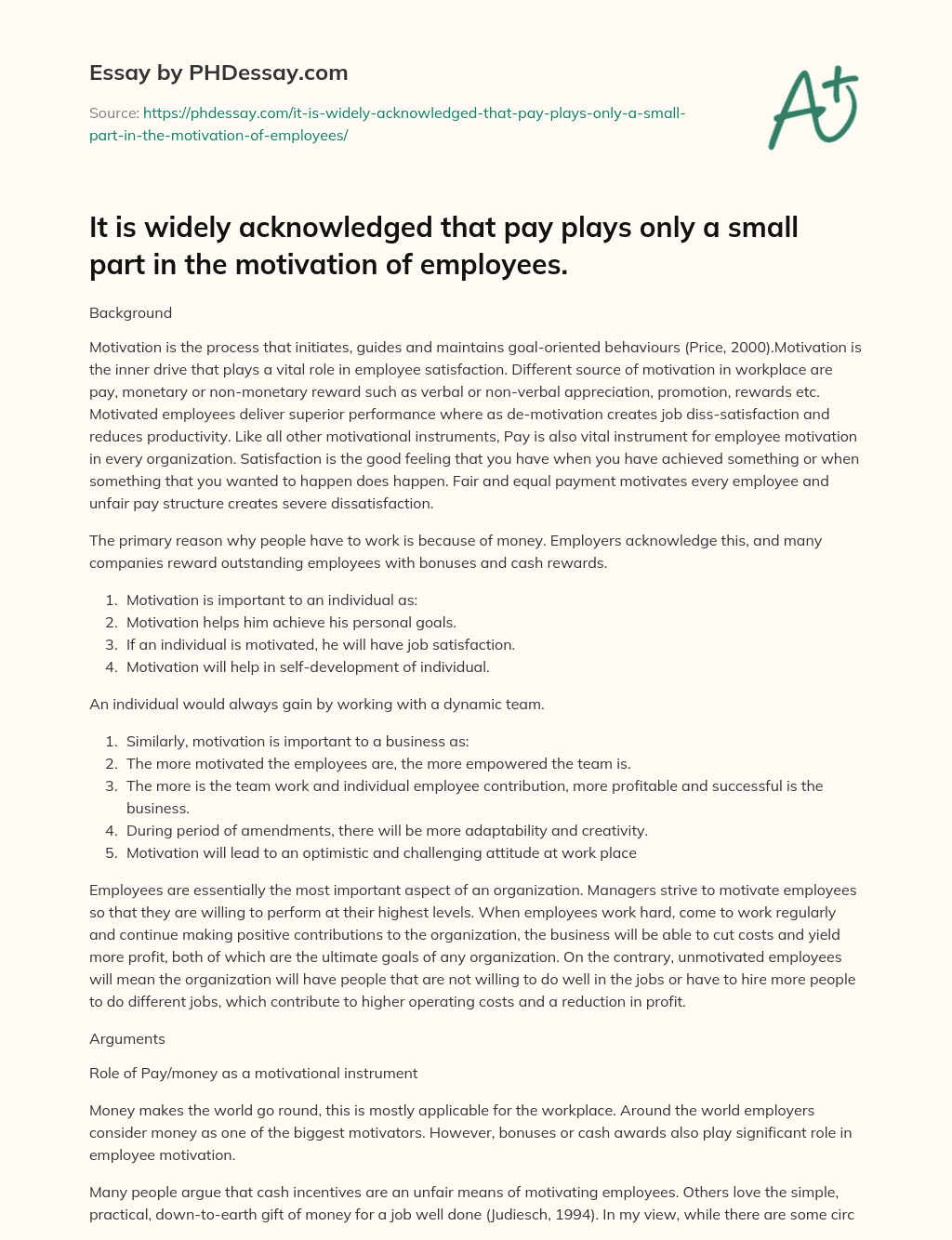 Importance of Motivation and Fair Pay in Employee Satisfaction and Performance. (2019, Mar 05). Retrieved from https://phdessay.com/it-is-widely-acknowledged-that-pay-plays-only-a-small-part-in-the-motivation-of-employees/