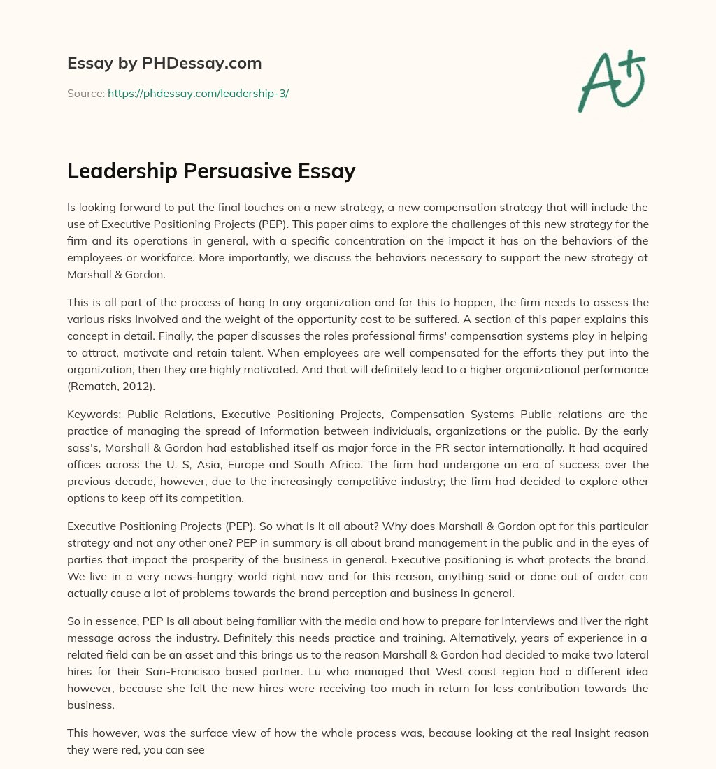 Order custom essay Leadership Persuasive Essay with free plagiarism report