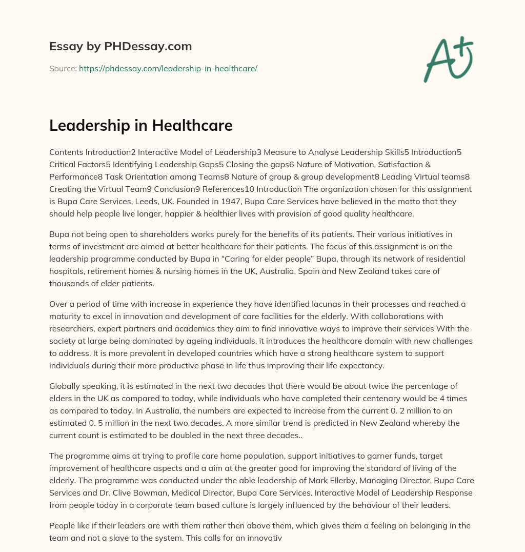 Contents Introduction2 Interactive Model of Leadership3 Measure to Analyse Leadership Skills5 Introduction5 Critical Factors5 Identifying Leadership Gaps5 Closing the gaps6 Nature of Motivation, Satisfaction & Performance8 Task Orientation among Teams8 Nature of group & group development8 Leading Virtual teams8 Creating the Virtual Team9 Conclusion9 References10 Introduction The organization chosen for this assignment is Bupa Care Services, Leeds, UK. Founded in 1947, Bupa Care Services have believed in the motto that they should help people live longer, happier & healthier lives with provision of good quality healthcare.