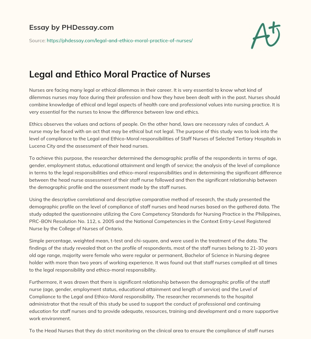 Order custom essay Legal and Ethico Moral Practice of Nurses with free plagiarism report