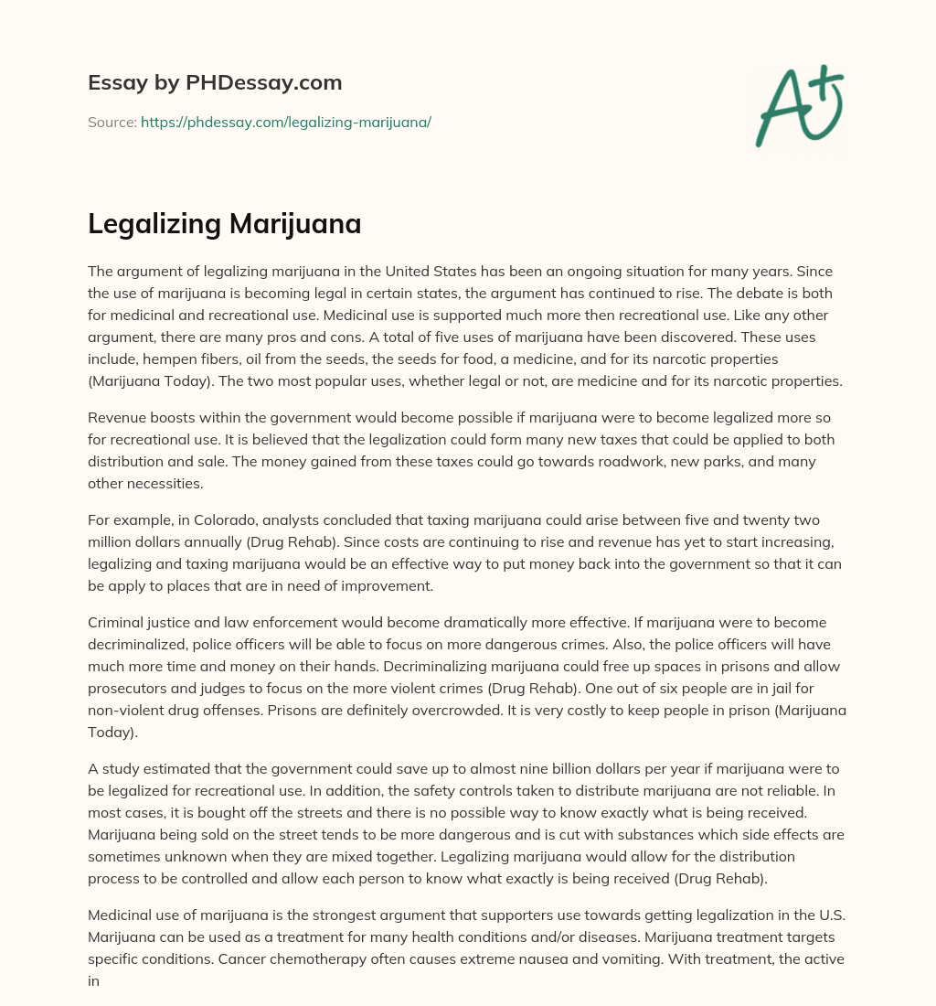 Order custom essay Legalizing Marijuana with free plagiarism report