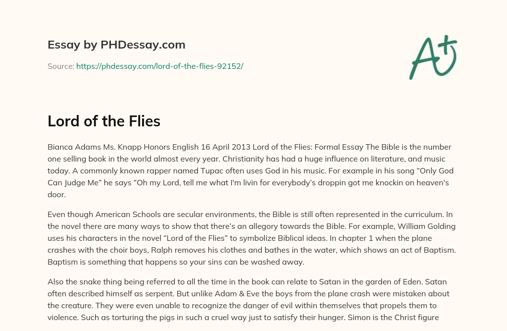 Bianca Adams Ms. Knapp Honors English 16 April 2013 Lord of the Flies: Formal Essay The Bible is the number one selling book in the world almost every year. Christianity has had a huge influence on literature, and music today. A commonly known rapper named Tupac often uses God in his music. For example in his song “Only God Can Judge Me” he says “Oh my Lord, tell me what I'm livin for everybody’s droppin got me knockin on heaven's door.