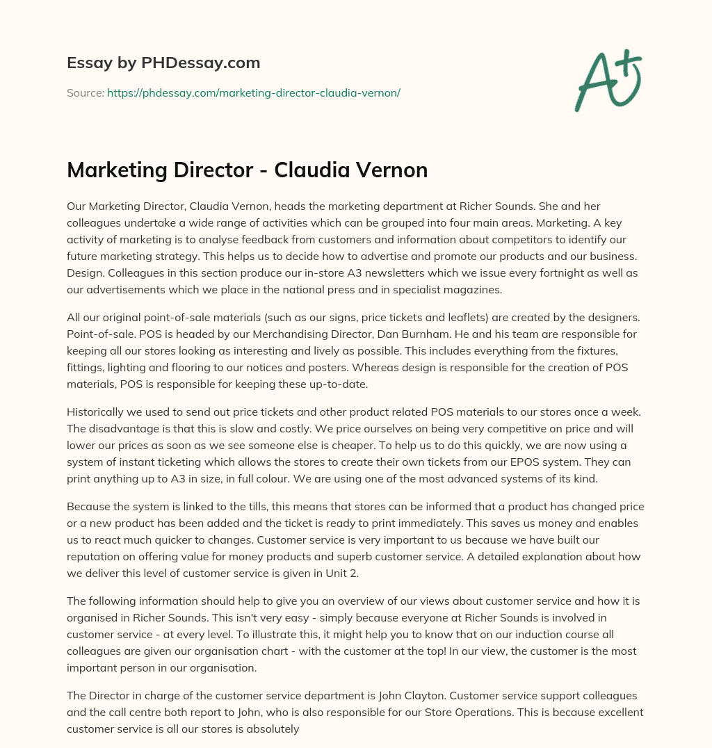 Order custom essay Marketing Director – Claudia Vernon with free plagiarism report