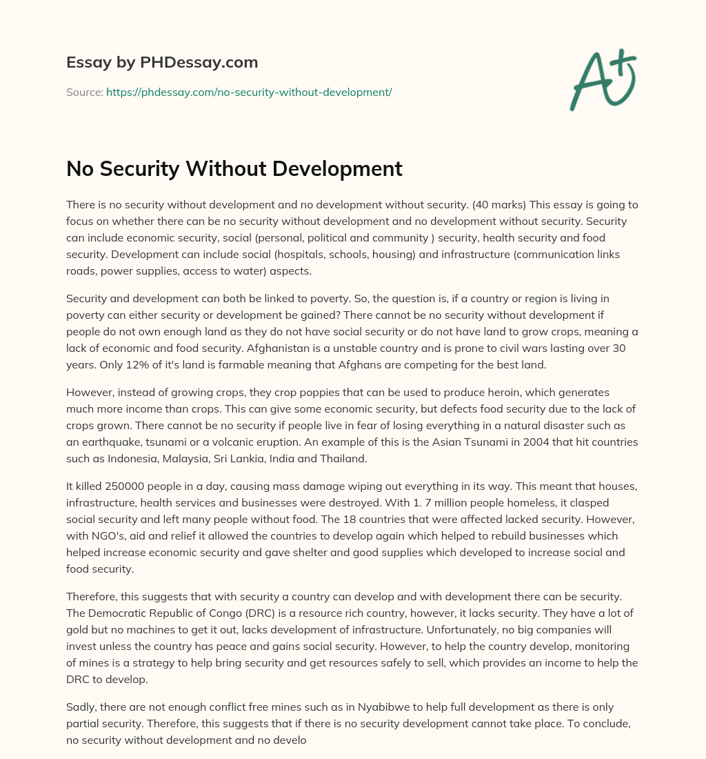 There is no security without development and no development without security. (40 marks) This essay is going to focus on whether there can be no security without development and no development without security. Security can include economic security, social (personal, political and community ) security, health security and food security. Development can include social (hospitals, schools, housing) and infrastructure (communication links roads, power supplies, access to water) aspects.