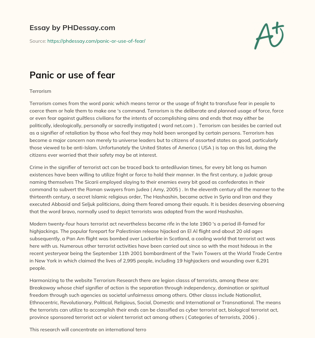 Panic or use of fear. (2017, Jul 05). Retrieved from https://phdessay.com/panic-or-use-of-fear/