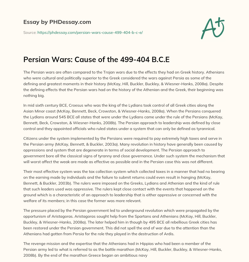 Persian Wars: Cause of the 499-404 B.C.E. (2017, Apr 18). Retrieved from https://phdessay.com/persian-wars-cause-499-404-b-c-e/