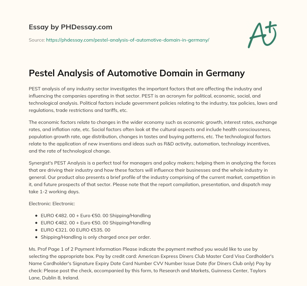 Order custom essay Pestel Analysis of Automotive Domain in Germany with free plagiarism report