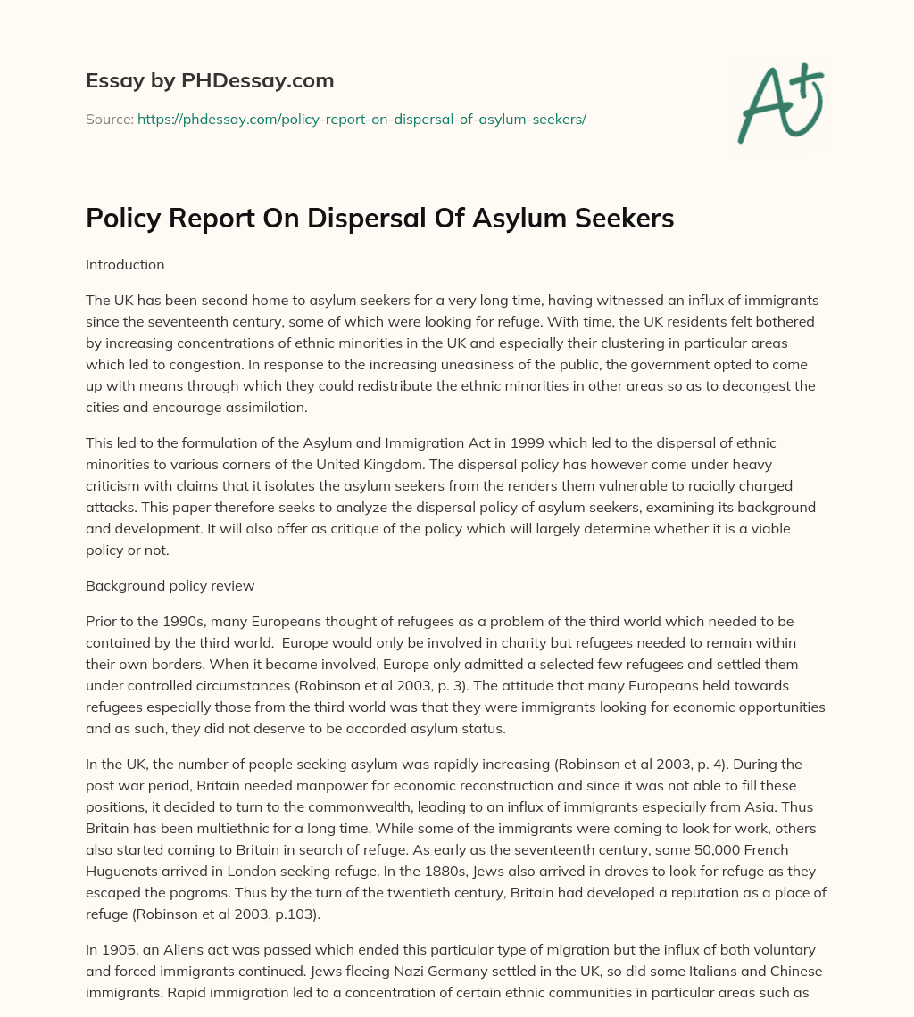Policy Report On Dispersal Of Asylum Seekers. (2016, Aug 22). Retrieved from https://phdessay.com/policy-report-on-dispersal-of-asylum-seekers/