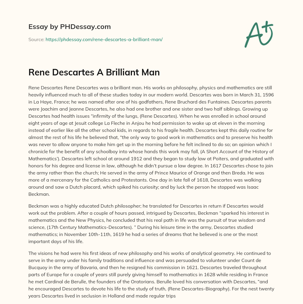 Rene Descartes A Brilliant Man. (2016, Dec 15). Retrieved from https://phdessay.com/rene-descartes-a-brilliant-man/