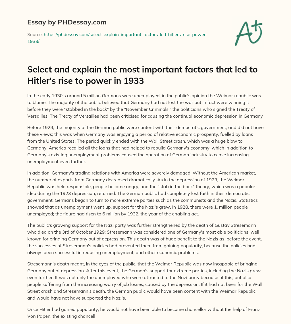 Select and explain the most important factors that led to Hitler’s rise to power in 1933. (2017, Nov 12). Retrieved from https://phdessay.com/select-explain-important-factors-led-hitlers-rise-power-1933/