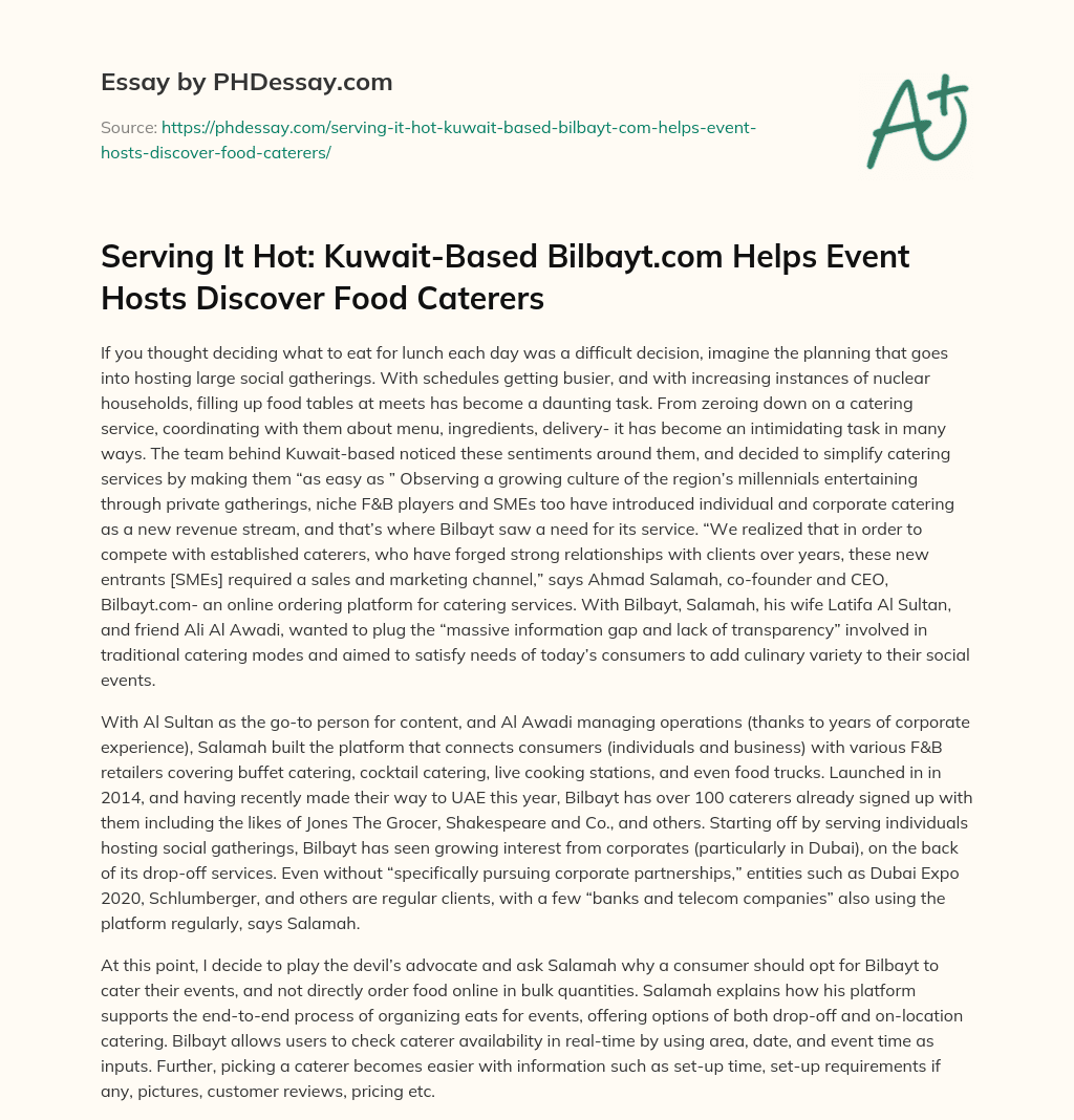 Order custom essay Serving It Hot: Kuwait-Based Bilbayt.com Helps Event Hosts Discover Food Caterers with free plagiarism report