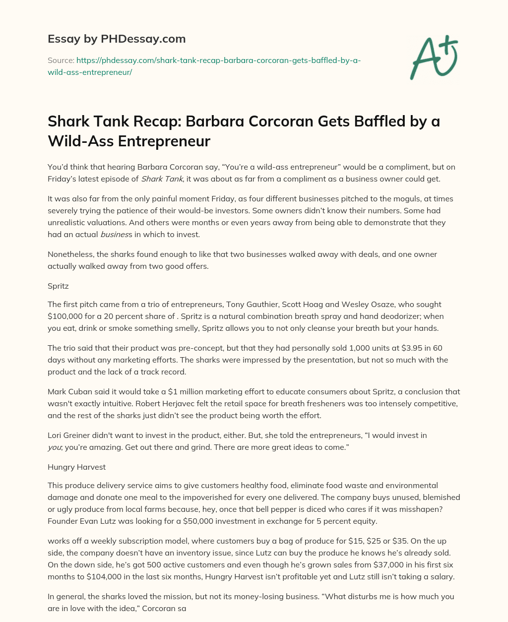 Order custom essay Shark Tank Recap: Barbara Corcoran Gets Baffled by a Wild-Ass Entrepreneur with free plagiarism report
