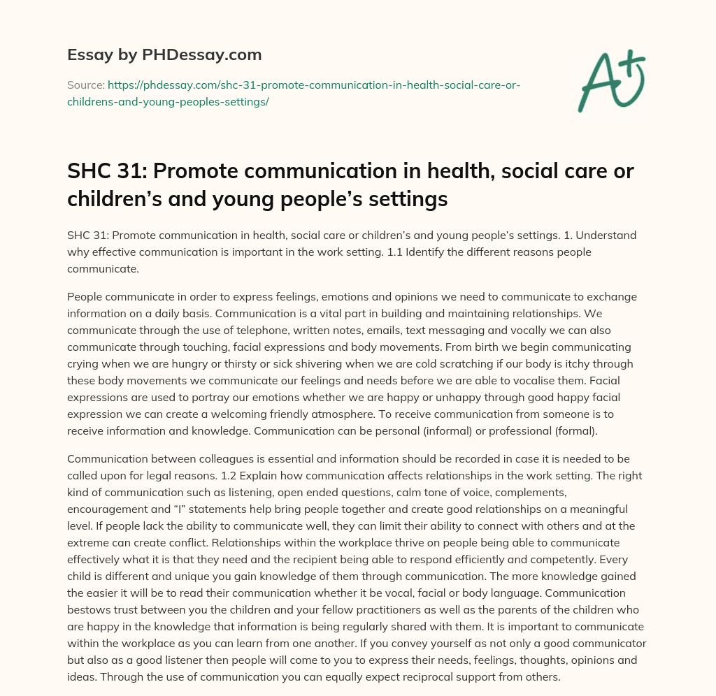 SHC 31: Promote communication in health, social care or children’s and young people’s settings. 1. Understand why effective communication is important in the work setting. 1.1 Identify the different reasons people communicate.
