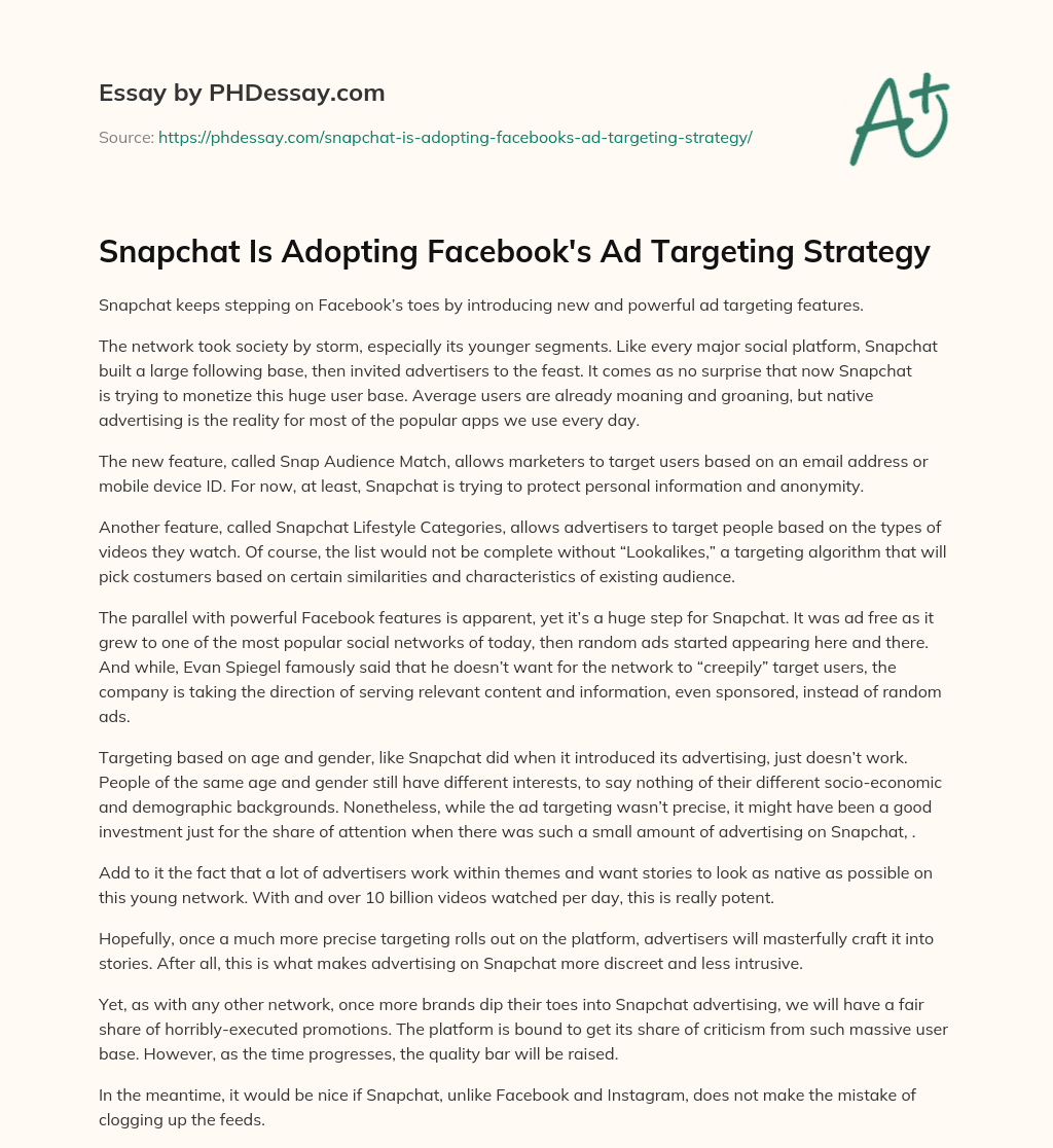 Order custom essay Snapchat Is Adopting Facebook’s Ad Targeting Strategy with free plagiarism report