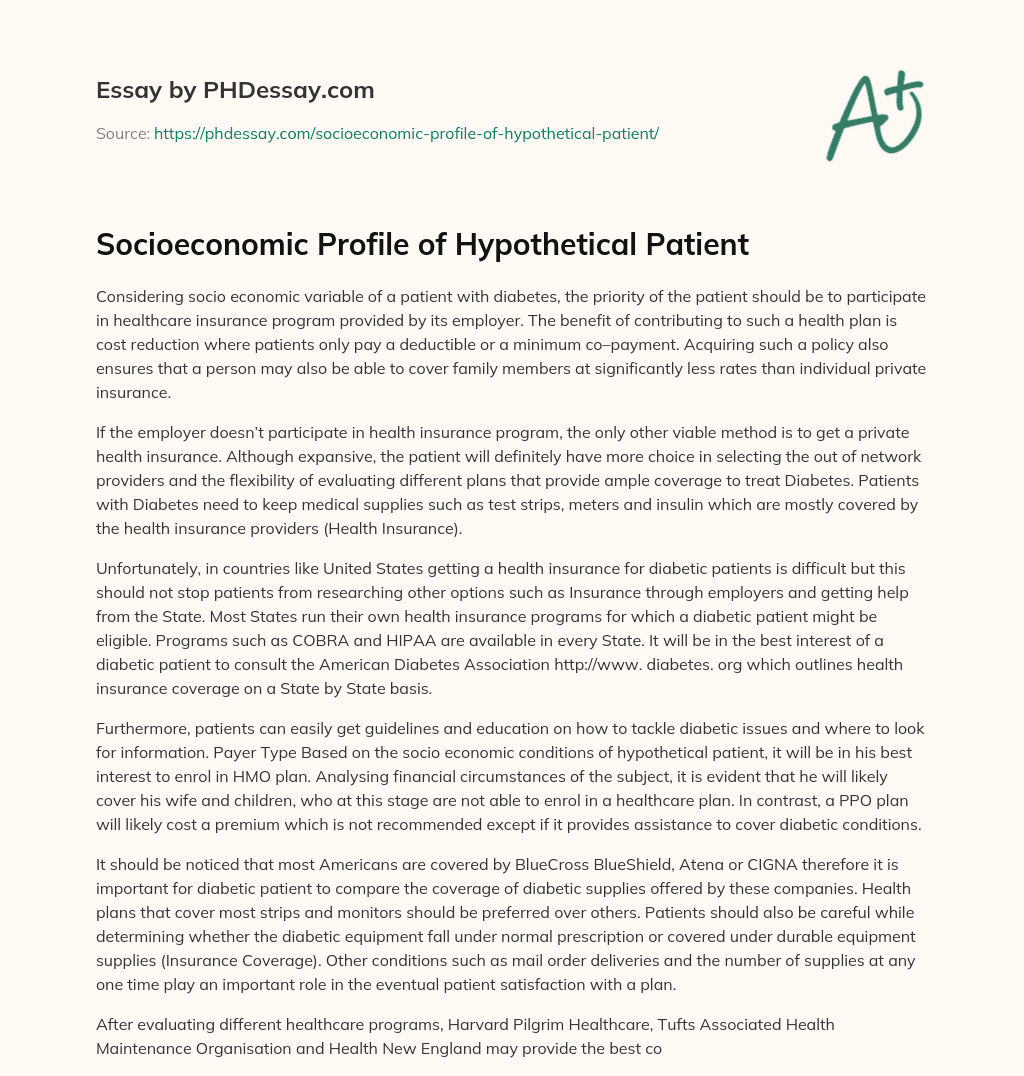 Considering socio economic variable of a patient with diabetes, the priority of the patient should be to participate in healthcare insurance program provided by its employer. The benefit of contributing to such a health plan is cost reduction where patients only pay a deductible or a minimum co–payment. Acquiring such a policy also ensures that a person may also be able to cover family members at significantly less rates than individual private insurance.