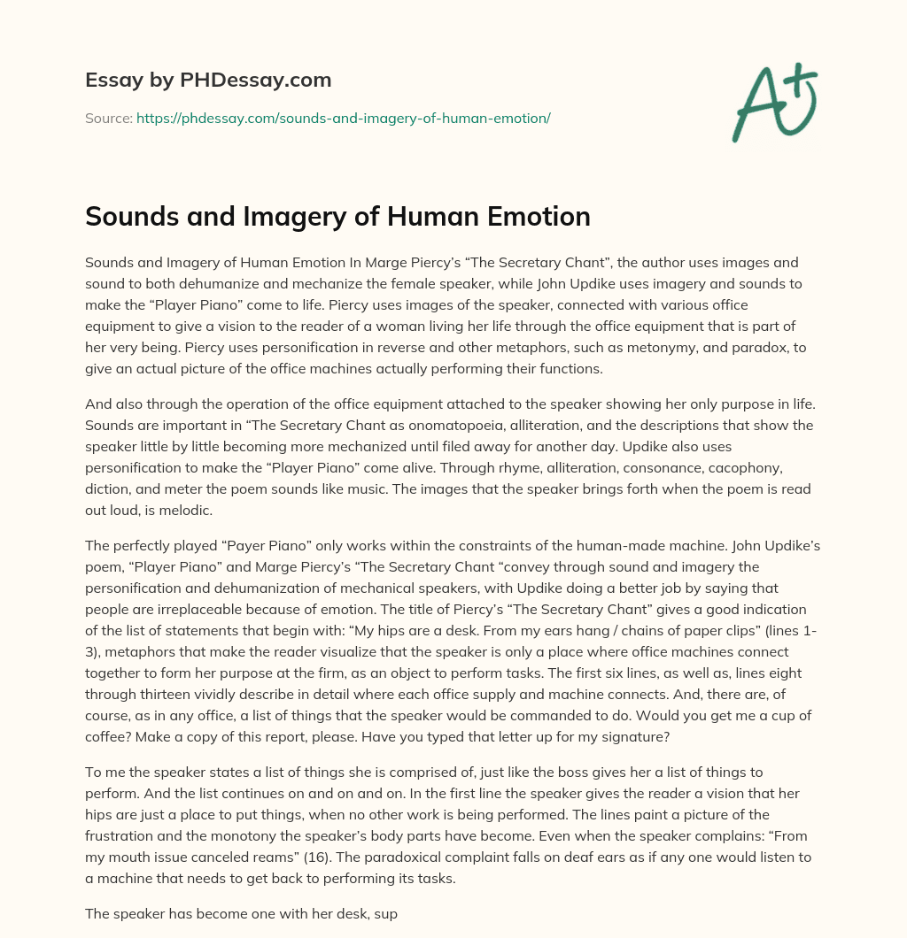 Sounds and Imagery of Human Emotion In Marge Piercy’s “The Secretary Chant”, the author uses images and sound to both dehumanize and mechanize the female speaker, while John Updike uses imagery and sounds to make the “Player Piano” come to life. Piercy uses images of the speaker, connected with various office equipment to give a vision to the reader of a woman living her life through the office equipment that is part of her very being. Piercy uses personification in reverse and other metaphors, such as metonymy, and paradox, to give an actual picture of the office machines actually performing their functions.